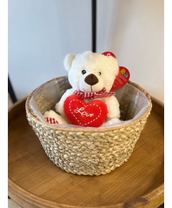 Jardinera ovalada de arpillera natural y roja para plantas. Ideal para dos plantas con maceta ES12. Colgante en forma de corazón rojo y mensaje "Love you".
