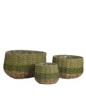 Descripción: Originales canastos hechos a mano de fibra de cuerda de papel y fibra natural, con franjas en color verde. Juego de 3 cestos confeccionados a mano en tamaños variados. Cestos para decoración de bodas, eventos y composición floral. Cestas de Floristería.
