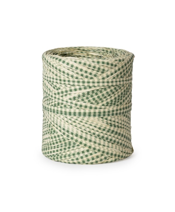 Rafia o raphia sintética plastificada con cuadritos Vichy crema y verde, ideal para atar ramos de flores o complementar regalos. Disponible en una gran variedad de colores y estampados distintos, en bobinas de 200 metros. Tenemos una gran variedad de colores y estampados distintos. Rafia de alta calidad.