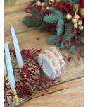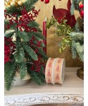 Cinta de algodón crema con estrellas rojas de purpurina. Extremos alambrados. Cintas navideñas de alta calidad para complementar los regalos, plantas y flores en fiestas navideñas. Proveedores de complementos para floristería y otros comercios. Proveedores de cintas de Navidad de alta calidad. Cintas textiles para envolver regalos de Navidad.