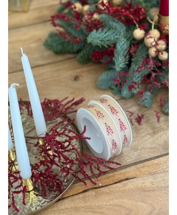 Cinta textil crema y Merry X-Mas con Abetos en Rojo y purpurina. Cintas textil Navideñas de alta calidad para complementar los regalos, plantas y flores en Navidad. Proveedores de complementos para floristería y otros comercios. Proveedores de cintas de Navidad de alta calidad. Cintas textiles para envolver regalos de Navidad.