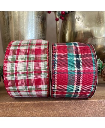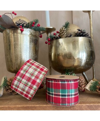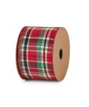 Cinta de saco con alambre en los extremos. Diseño de cuadro escocés. Ideal para decoración de regalos o ramos de flores. Proveedores de complementos para floristería y otros comercios. Proveedores de cintas de Navidad de alta calidad. Cintas textiles para envolver regalos de Navidad.