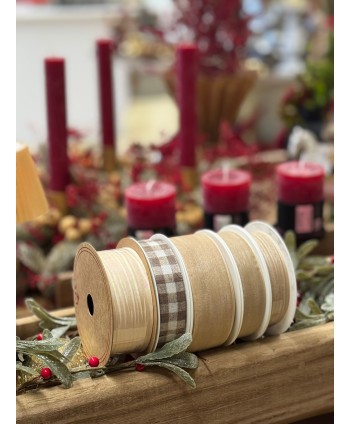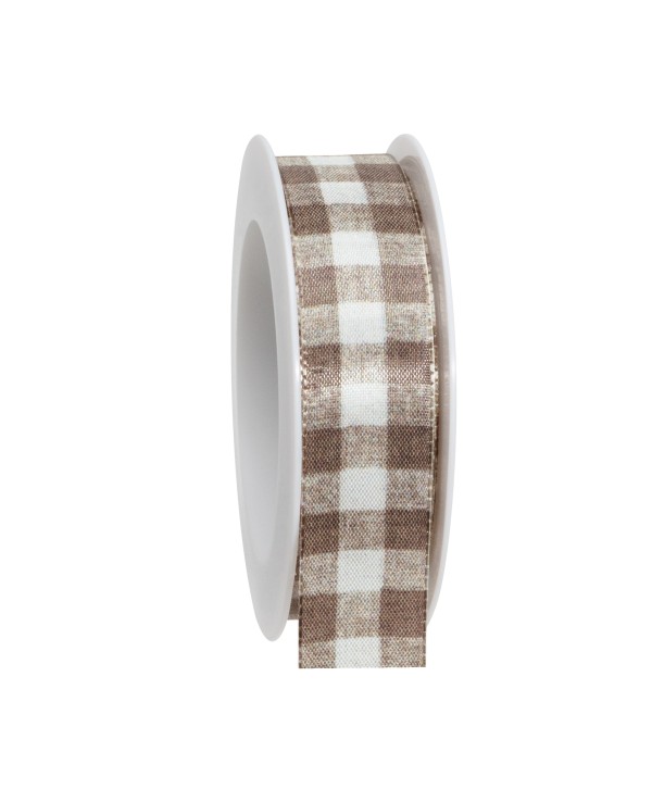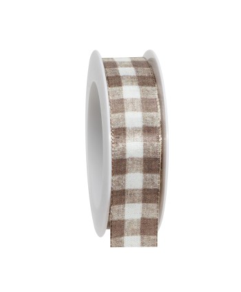 Cinta textil marrón con cuadrículas grandes de estilo VICHY, ideal para decoraciones de ramos de flores, bodas, lazos, etc. Proveedores de complementos para floristerías y otros comercios. Proveedores de cintas de calidad decorativas de la mejor calidad.