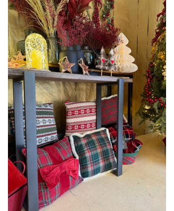 Original cojín con diseño de cuadros navideños y relleno incluido. Doble cara lista de color verde. Cojín con margen de pelo sintético. Ideal para decorar espacios: una cama, un sillón o un sofá...