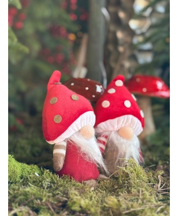 Descripción: Figura textil de gnomo hecha a mano, con gorro rojo y topos, en color blanco y marrón. Brazos a rayas y barba blanca. Figuras para las decoraciones más originales esta Navidad.