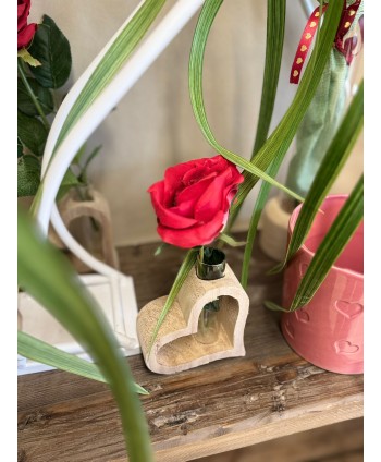 Jarrón de madera natural con forma de corazón y tubo de cristal para flor cortada. Precioso detalle para la persona más especial. Corazón natural. Decoración de bodas y eventos. Colección de San Valentín.