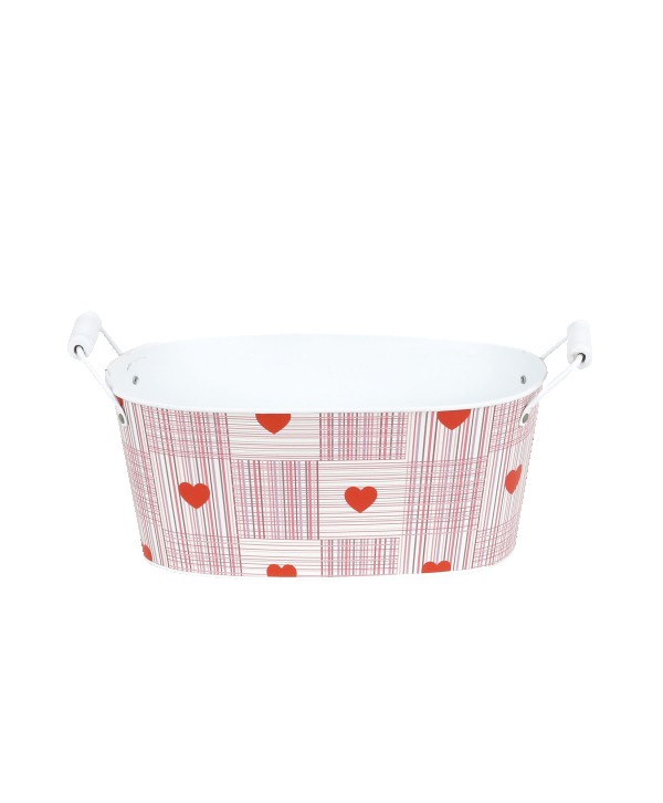 Cesta ovalada blanca oval de zinc con corazones rojos y cuadros de diseño lineal, con dos asas. Ideal para ocasiones especiales, San Valentín, Sant Jordi, día de la madre... Proveedores de complementos para floristería y comercios de decoración. Proveedores de corazones de zinc.