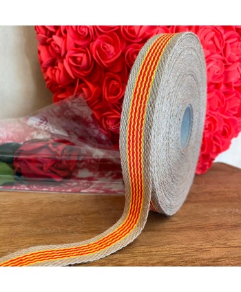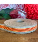 Cinta de algodón don diseño de la bandera catalana y aragonesa Doble Cara y bordes de yute natural. Cinta para el día de Sant Jordi. Cinta catalana de algodón para Sant Jordi. Cinta catalana para complementar la rosa de Sant Jordi o regalos del día del libro. Cinta de la bandera de Cataluña.