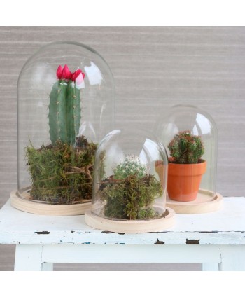 Cúpula de Cristal con base de Madera "Mini". Cúpula de la Bella y la Bestia en todos los tamaños para composición floral. Urna de Cristal para el ramo de Novia. Proveedores al mayor de cúpulas y tubos. Decoración con elementos de cristal. Cúpulas con diferentes bases y tamaños. Mayoristas de floristerías.