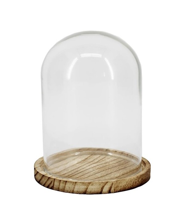 CÚPULA DE CRISTAL MINI Y BASE MADERA Ø 10-11,5 x H 14,5cm.
