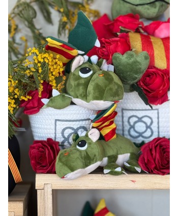 Descripción: Dragón de Peluche acostado, con las alas con la Señera y corazón rojo en la cola. Complementos de decoración especial de la Diada de Sant Jordi. Original dragón de Sant Jordi para complementar la rosa y el libro. El Dragón es el complemento perfecto para decorar el escaparate para la diada de Sant Jordi. Dragón Decorativo para la Rosa de Sant Jordi. Dragón de peluche pequeño, ideal para el día de Sant Jordi. Dragón de peluche precioso de alta calidad, para regalar con la rosa roja. Complementa la rosa.