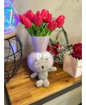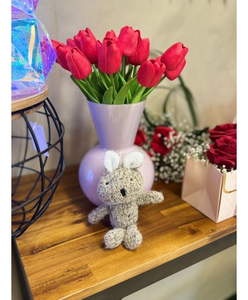 Osito de peluche marrón, con ramo de flores. Osito para toda la temporada. Proveedores al mayor de peluches para quien más quieres, tu persona especial.