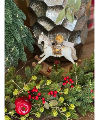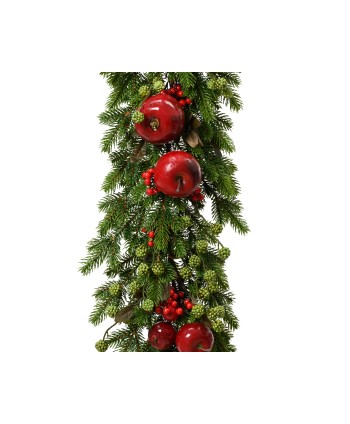 Descripción: Guirnalda de pino verde artificial, con berries decorativos y manzanas rojas. Para decoración de centros navideños o para la puerta en Navidad. Complementos de decoración de Navidad.