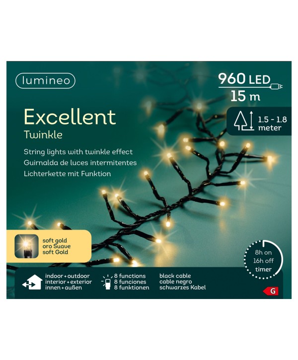 Descripción: Tira de luces EXCELLENT, LEDS intermitentes que combinan el formato de luz compact con la forma del clúster, con el cable negro, temporizador de 8 horas y 8 funciones distintas. Son ideales para árboles bien iluminados y compactos.