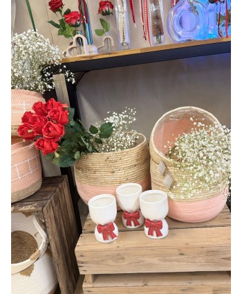 Jarrón de cerámica BOWY hecho a mano, en tono blanco y lazo rojo decorativo. Jarrones originales con detalles de lazos preciosos. Ideal para las decoraciones más originales.