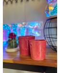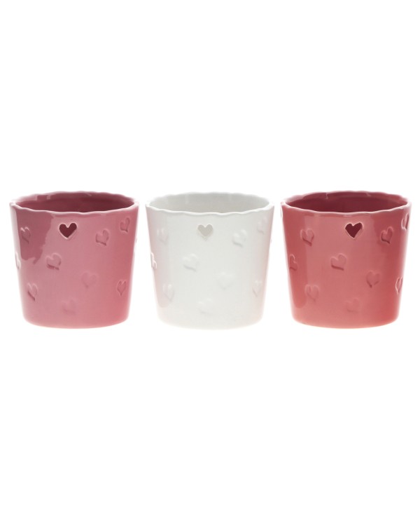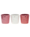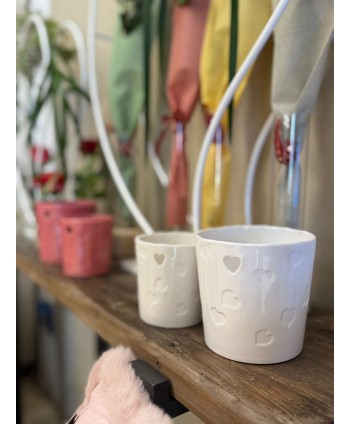 Descripción: Macetero redondo de cerámica brillante con corazones en relieve. Macetas en tonos blanco, rosa y rojo. Ideal para una planta con diámetro de Ø12cm. (ES12cm.). Macetas para complementar plantas en regalos de San Valentín.