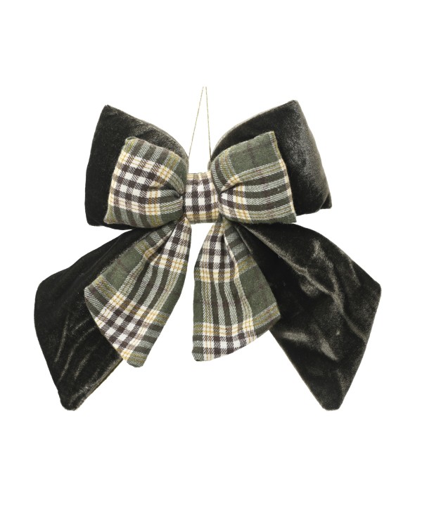 Colgante de lazo doble de terciopelo con cuadros decorativos. Lazos para decoración navideña. Lazos en tendencia para decorar. Lazo con colgante para el árbol de Navidad. Proveedor de complementos para floristería y otros comercios. Proveedor de artículos de Navidad.
