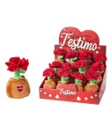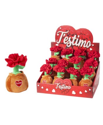 Descripción: Rosa de peluche y terciopelo en un tiesto con un corazón y la palabra "T'ESTIMO". Peluches para San Valentín o Sant Jordi. Peluches al por mayor de alta calidad.