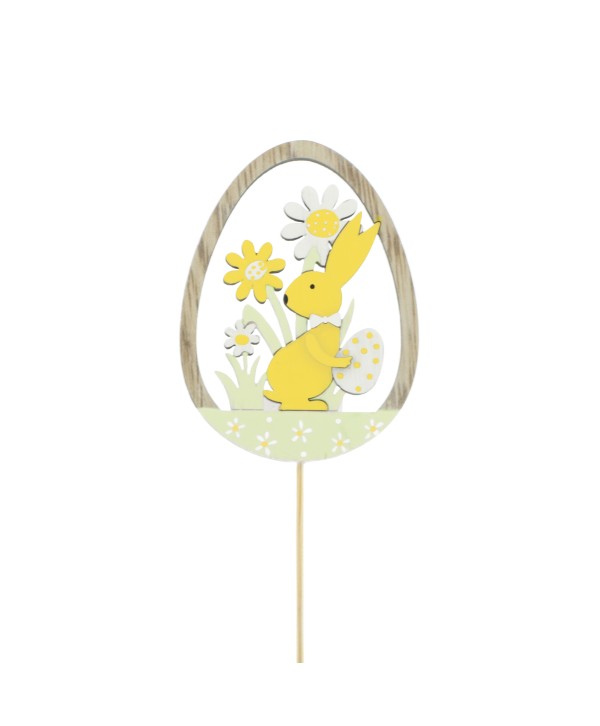 Pick de madera en forma de Huevo con Conejo y flores. Pick de Madera con altura de 50cm.