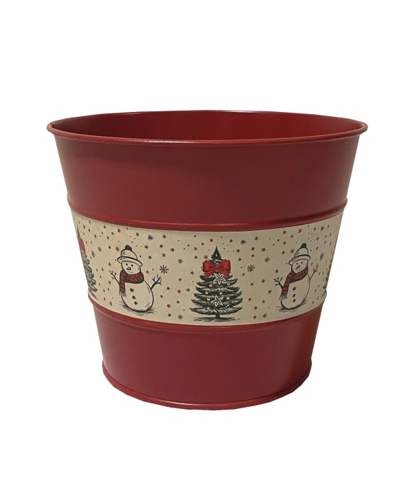 CUBO DE ZINC "MUÑECO DE NIEVE" REDONDO ROJO Ø 17 x H 14cm.