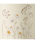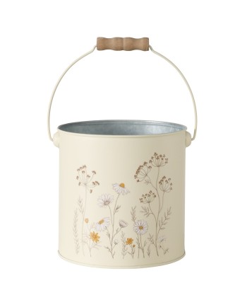 Cubo o maceta de zinc redonda pintada a mano, con diseño de flores sobre un fondo crema mate y una asa con el mango de madera natural. Proveedores de Complementos para Floristería y Comercio de decoración. Proveedores de centros de zinc para plantas.
