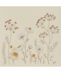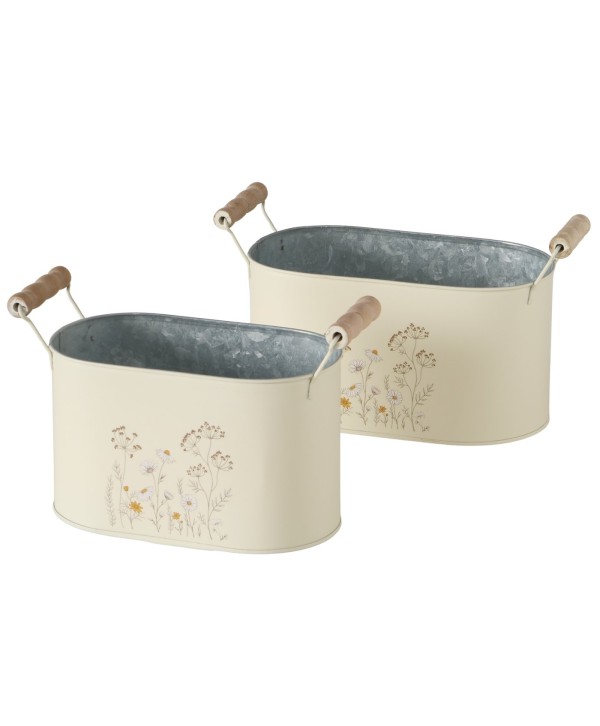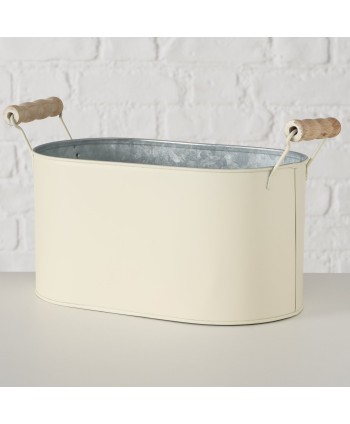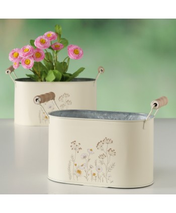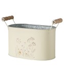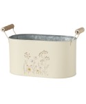 Jardinera de zinc ovalada pintada a mano, con diseño de flores sobre un fondo crema mate y una asa con el mango de madera natural. Proveedores de Complementos para Floristería y Comercio de decoración. Proveedores de centros de zinc para plantas.