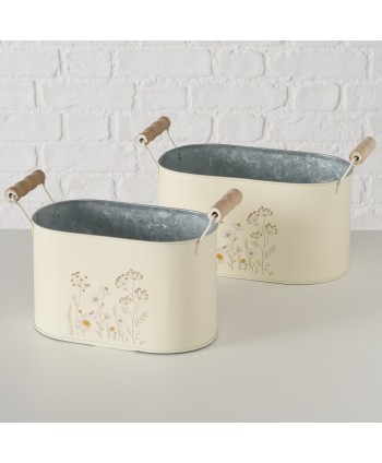 Descripción: Jardinera de zinc ovalada pintada a mano, con diseño de flores sobre un fondo crema mate y una asa con el mango de madera natural. Proveedores de Complementos para Floristería y Comercio de decoración. Proveedores de centros de zinc para plantas.